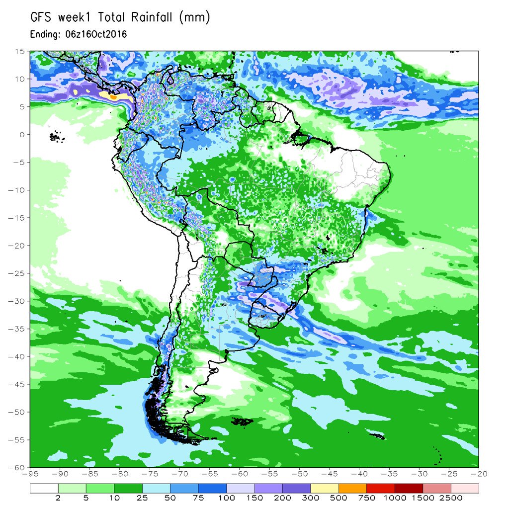 TEMPO | Vem muita água para o Estado. Projeção de chuva acumulada até 16 de outubro do modelo americano GFS.